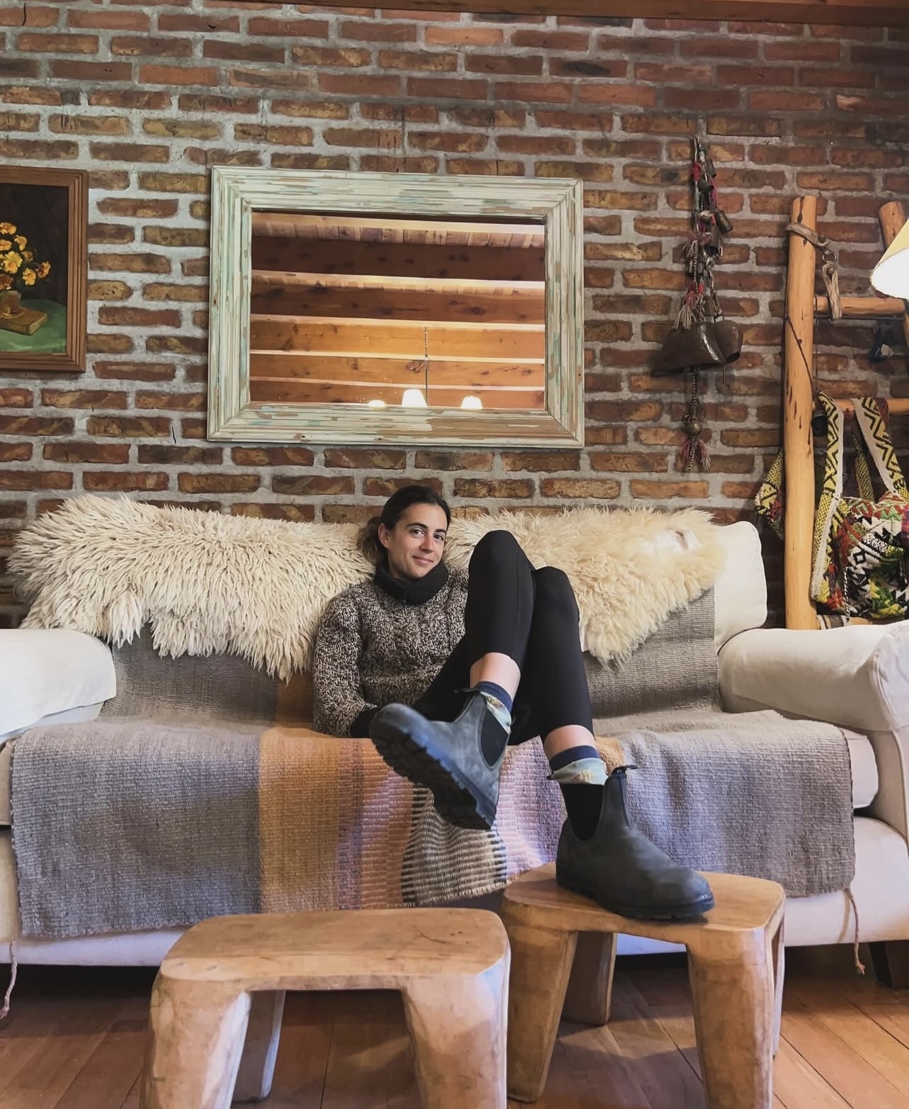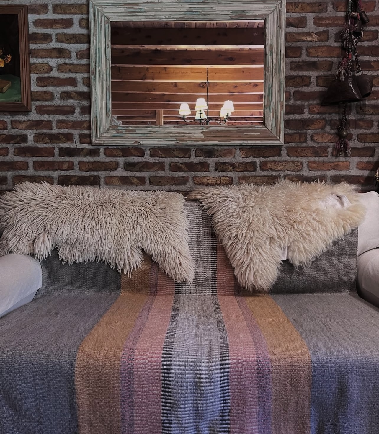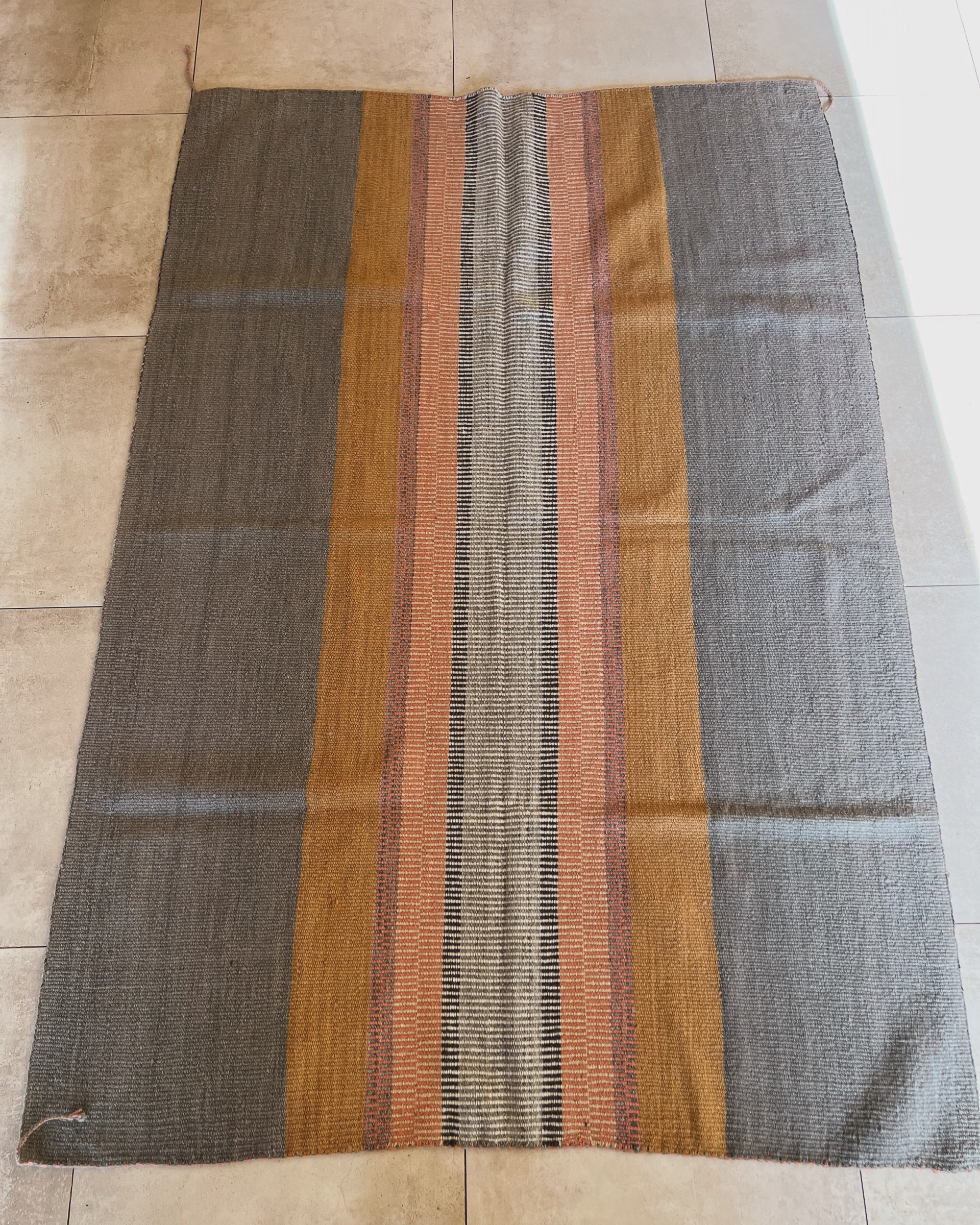 Matron tejido con lana de oveja. Hilado 100% a mano. Tintes naturales. Trama: peineicillo. Tecnica ancestral. Telar vertical mapuche. Se puede usar como alfombra, cubrecama, tapiz.