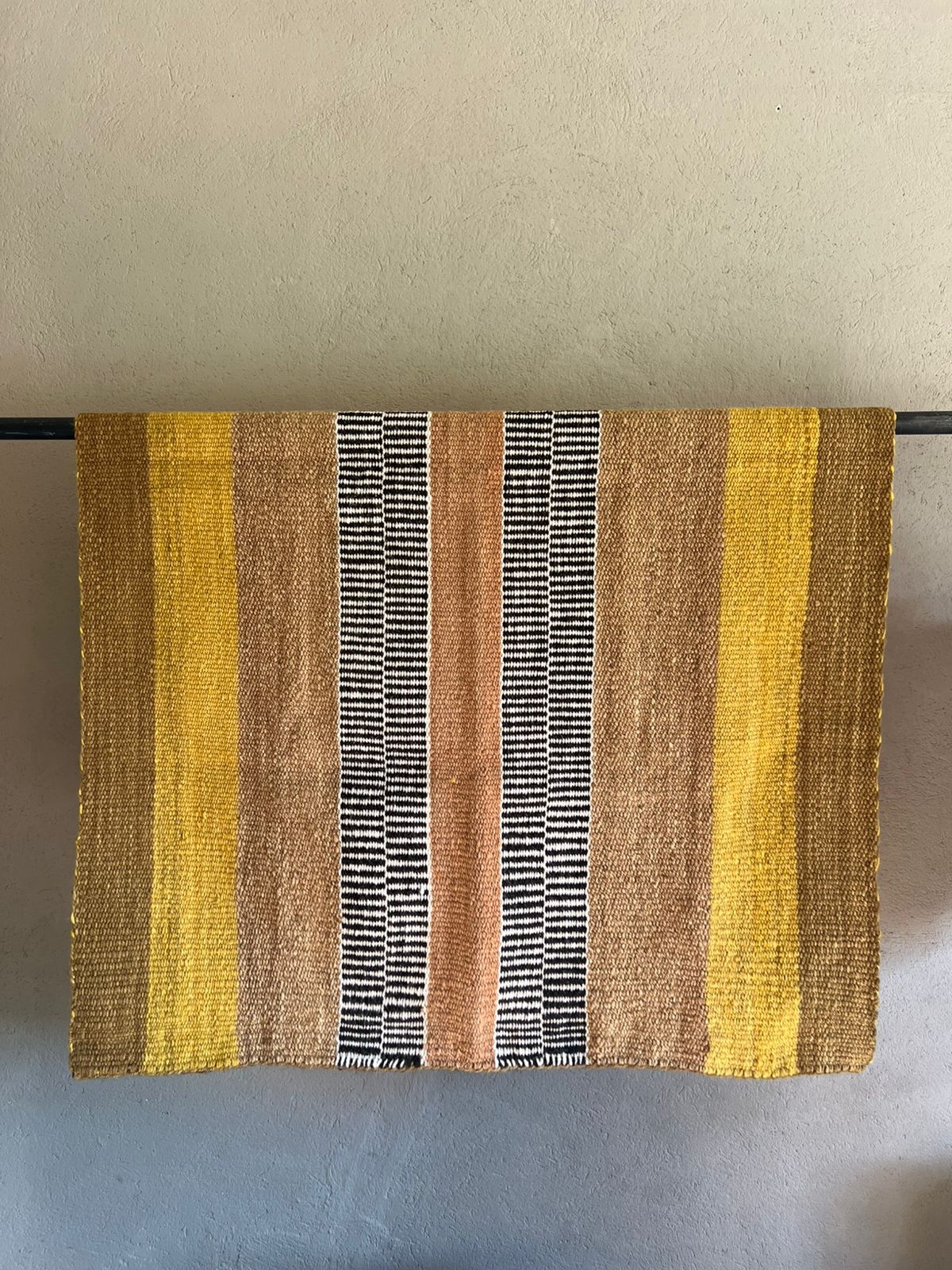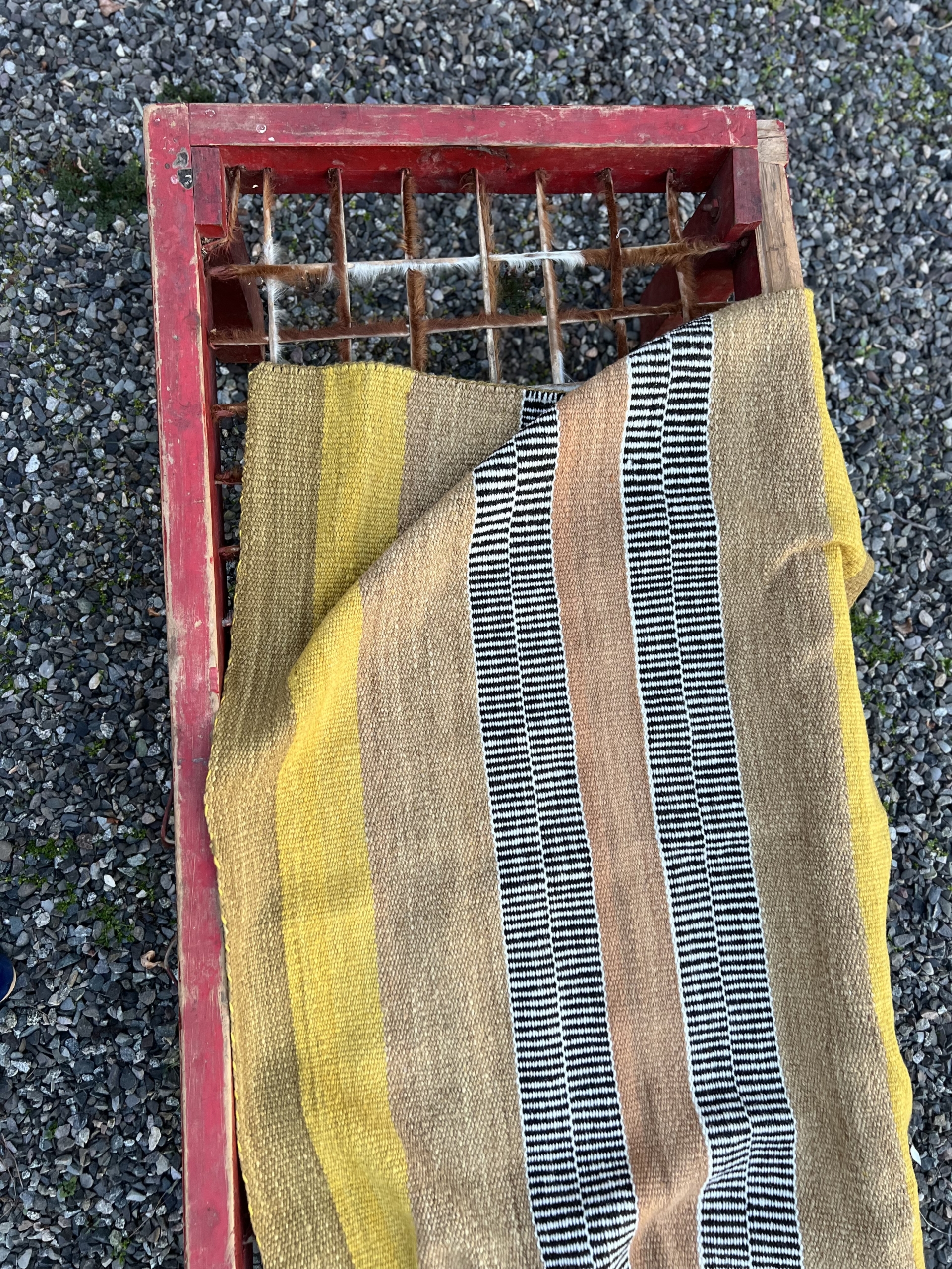 Matra tejida con lana de oveja. Hilado 100% a mano. Tintes naturales. Trama: peineicillo. Tecnica ancestral. Telar vertical mapuche. Se puede usar como alfombra, pie de cama, tapiz.