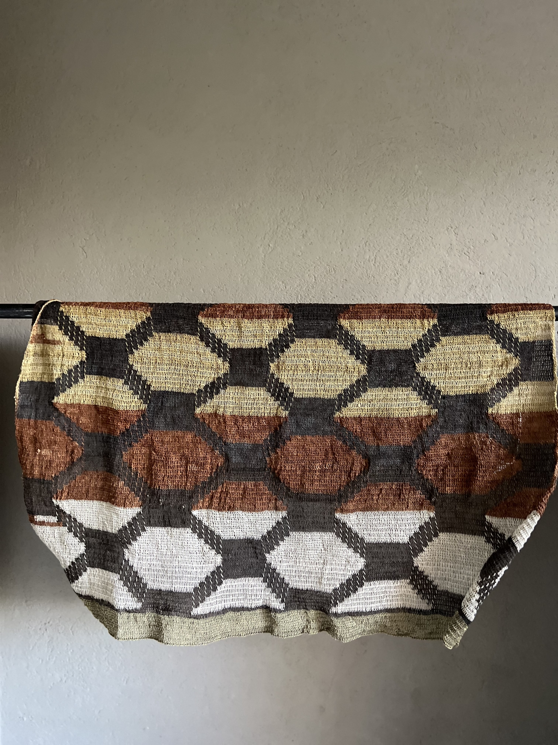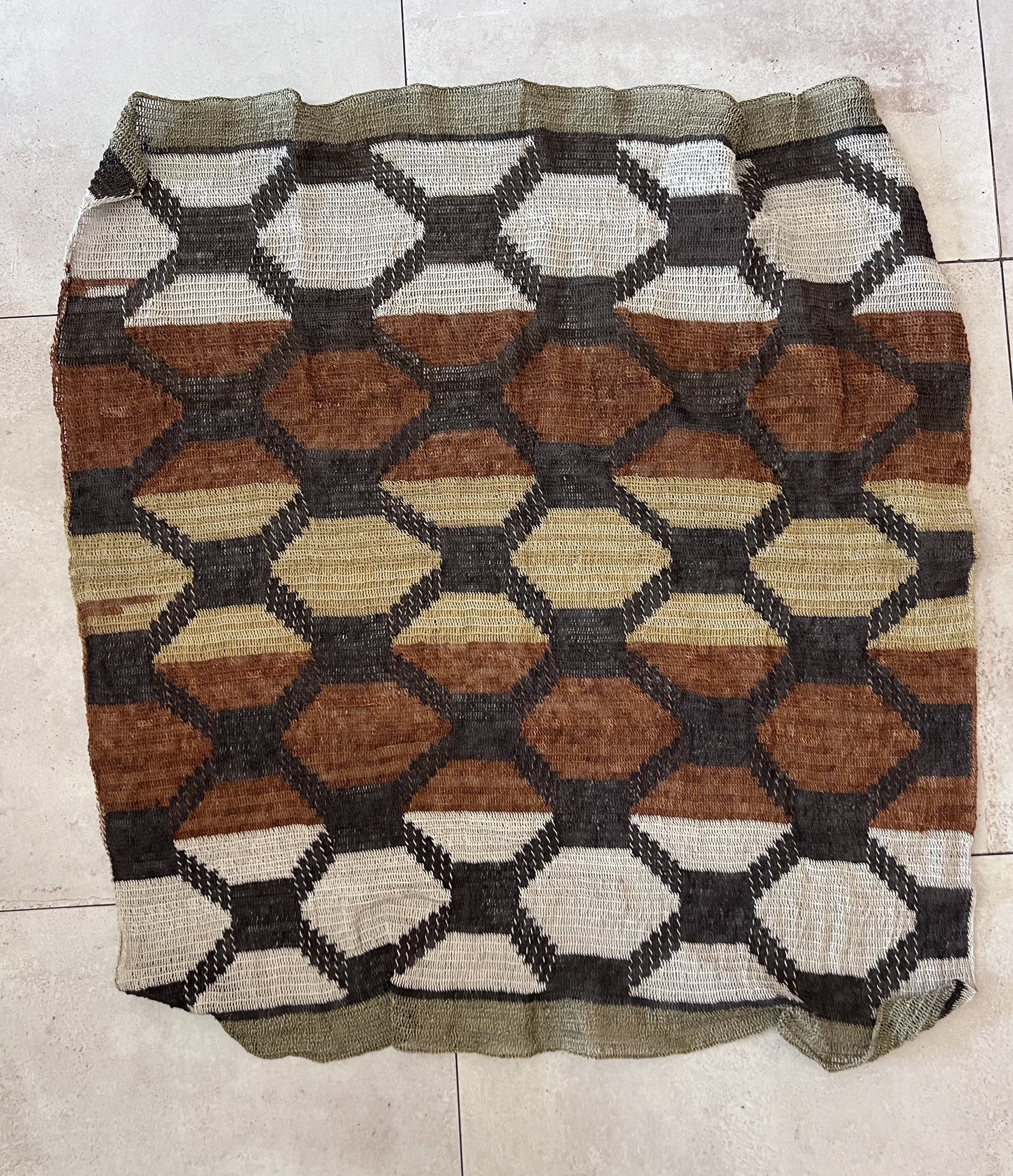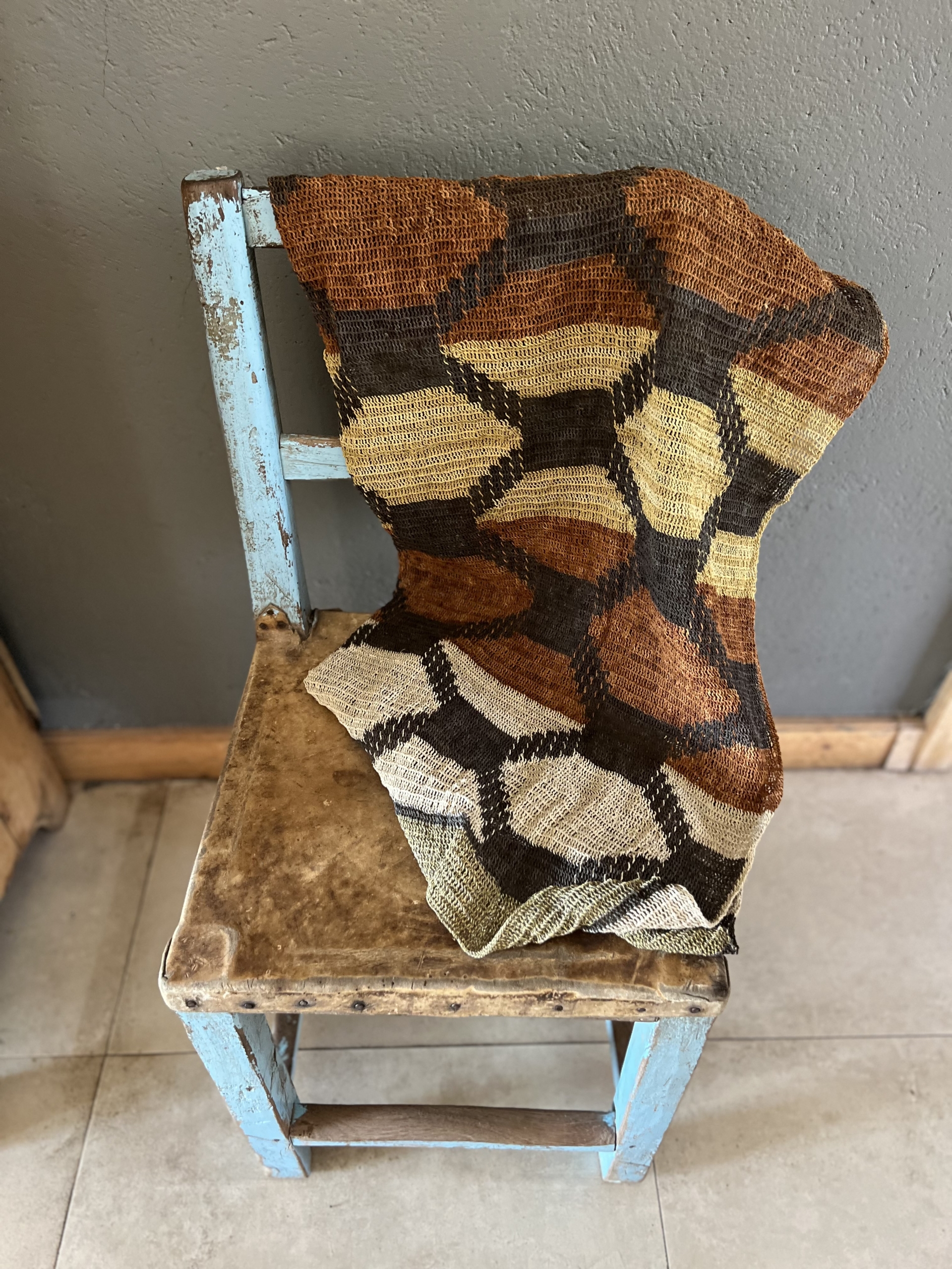 Paño de chaguar. Punto yica. Tejido 100% a mano. Fibras vegetales. Tintes naturales. No mojar. Usos varios: confección de prendas, decoración, enmarcados, tapices.