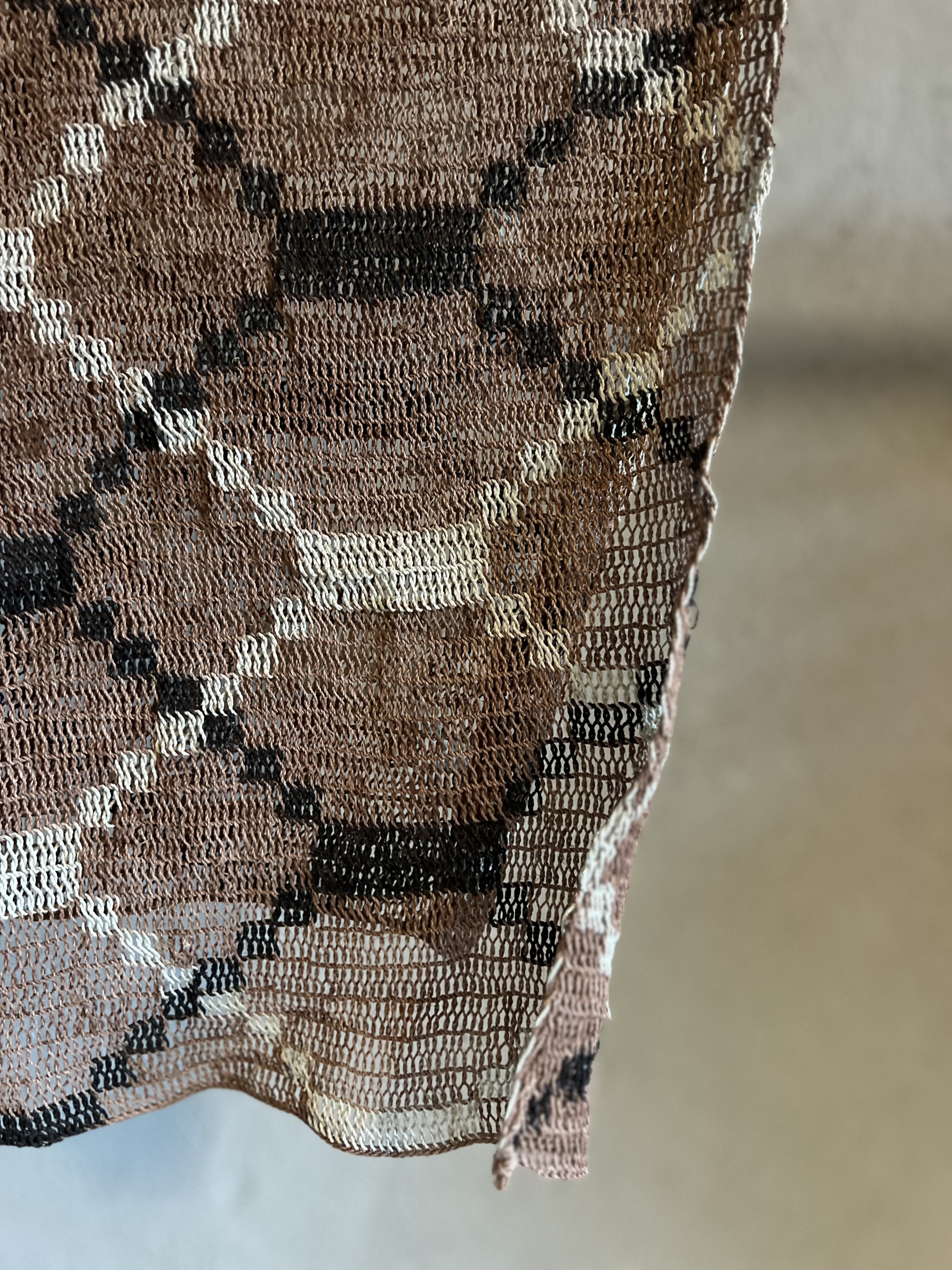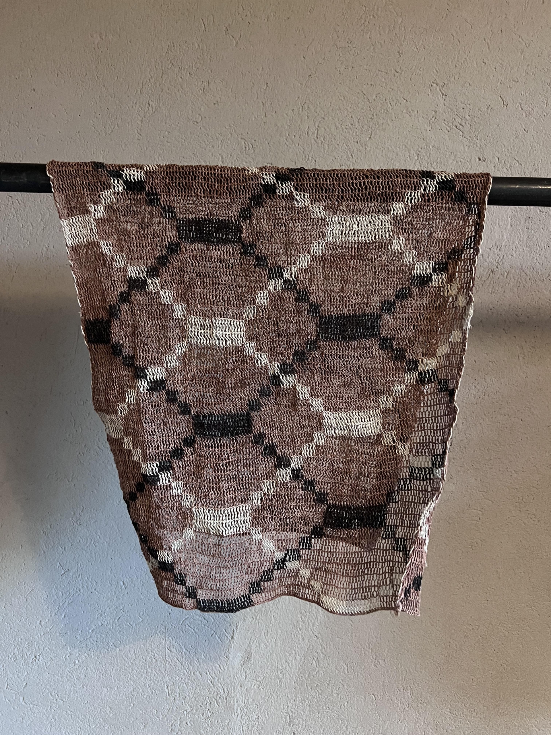 Paño de chaguar. Punto yica. Tejido 100% a mano. Fibras vegetales. Tintes naturales. No mojar. Usos varios: confección de prendas, decoración, enmarcados, tapices.