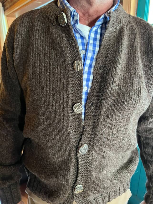 Sweater tejido a mano. Lana marrón natural, 100% de oveja. Talle único (entre M y L). Botones de asta de ciervo.